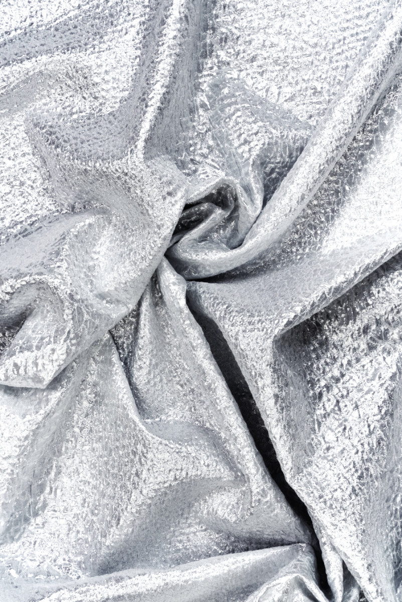 Poliestera žakarda audums ar sudraba motīvu, izliektiem elementiem. Modelis ir blīvs, bet diezgan mazs, un tā struktūra atgādina čūskas ādu. Audums ir plāns, bet necaurspīdīgs, neelastīgs, viegls, stingrs un tam ir augsts spīdums, pateicoties izmantotajam sudraba pavedienam. Īpašs piedāvājums cilvēkiem, kuriem patīk spīdēt. No tā jūs varat uzburt interesantas kleitas, svārkus, jakas un jakas.