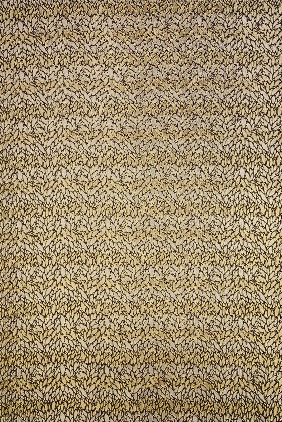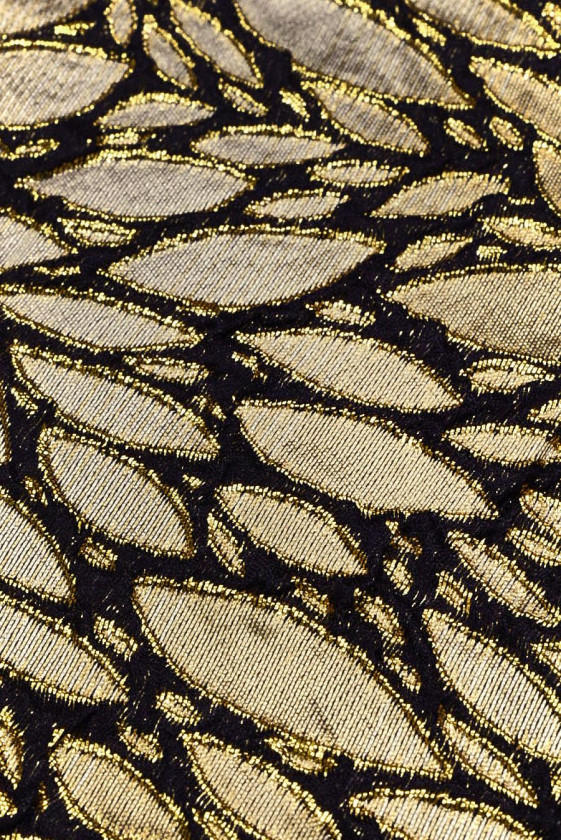 Poliestera žakarda audums ar lapu formas motīvu tumši tumši zilā, gandrīz melnās apmalēs. Ļoti blīvi novietotiem motīviem ir dažādi izmēri, mazākais ir 5 mm un lielākais ir 5 cm, tie ir piepildīti ar spīdīgu diegu divos zelta toņos. Siltāks un aukstāks zelts tiek austs pārmaiņus ik pēc 4 cm, radot svītras, kas dod interesantu ēnojuma efektu. No otras puses, tumši zilās robežas ir izliektas. Audums ir viegls, neelastīgs, vidēja biezuma un diezgan stingri pieguļ. To var izmantot, lai izveidotu vakara tērpus, piemēram, kleitas, svārkus, jakas.