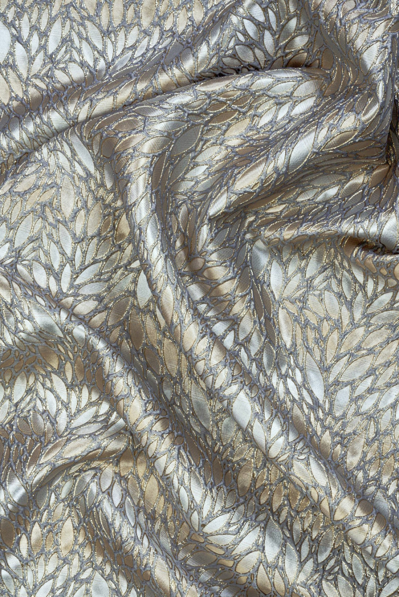Poliestera žakarda audums ar lapu formas motīvu gaiši pelēkās apmalēs. Ļoti blīvi novietotiem motīviem ir dažādi izmēri, mazākais ir 5 mm un lielākais ir 5 cm, tie ir piepildīti ar spīdīgu pavedienu divos smilškrāsas toņos. Siltāka un aukstāka bēškrāsa tiek austa pārmaiņus ik pēc 4 cm, radot svītras, kas dod interesantu ēnojuma efektu. No otras puses, pelēkās robežas ir izliektas. Audums ir viegls, neelastīgs, vidēja biezuma un diezgan stingri pieguļ. To var izmantot, lai izveidotu vakara tērpus, piemēram, kleitas, svārkus, jakas.