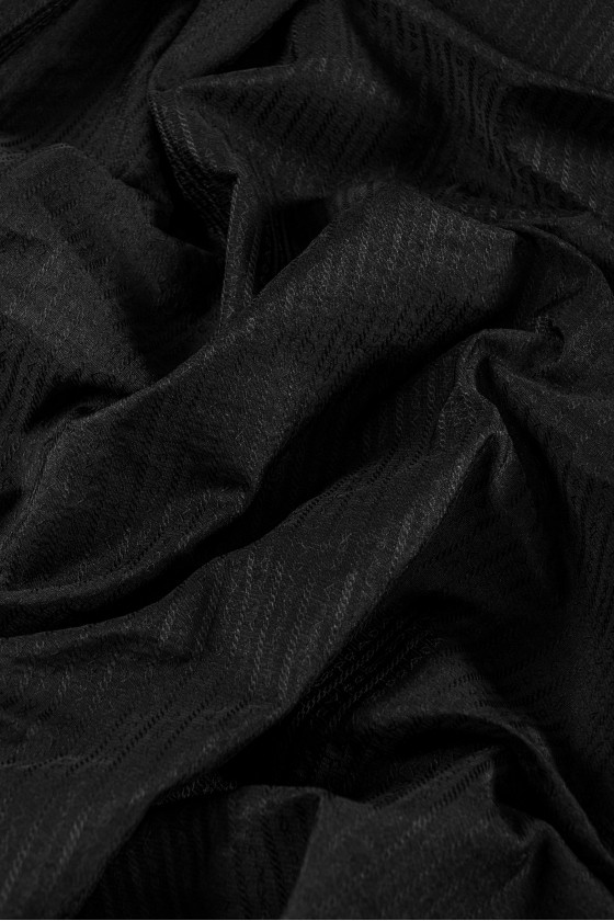 Itāļu žakarda kostīmu audums melnā krāsā ar maziem rakstiem. Audums ir parakstīts ar pazīstama modes nama nosaukumu.