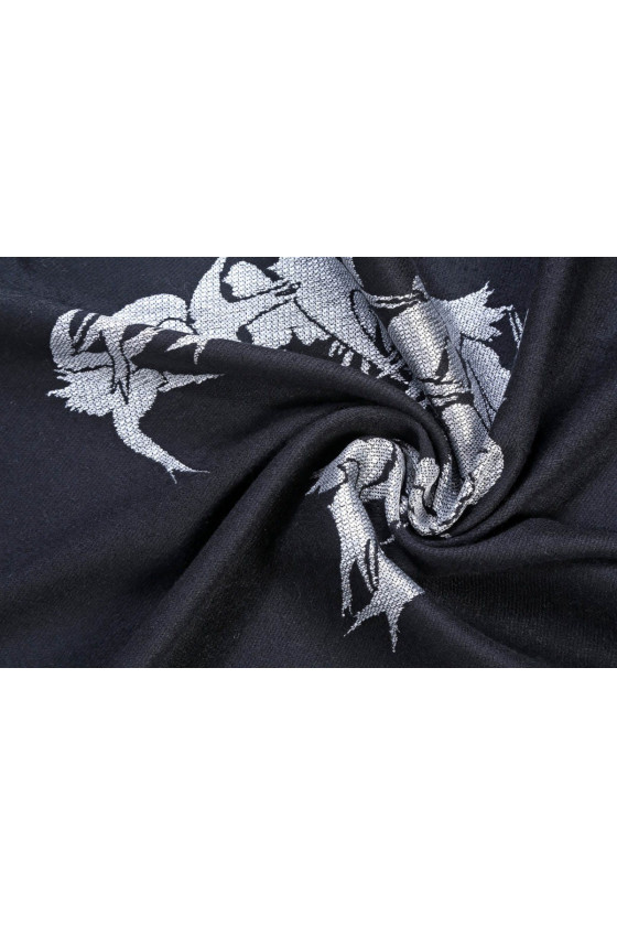 Itāļu žakarda audums kuponā ar izmēriem 65cm x 65cm. Ļoti interesants sudraba bezdelīgu modelis, kas veido jautājuma zīmi. Viss ir izšūts uz melna fona un dod ļoti oriģinālu efektu. Audumu var izmantot kā oriģinālu detaļu kombinācijā ar citu materiālu, piemēram, kā sporta krekla "priekšpusi" vai jakas "aizmuguri". Tas būs lieliski piemērots arī kā rotājums, piemēram, spilvens.