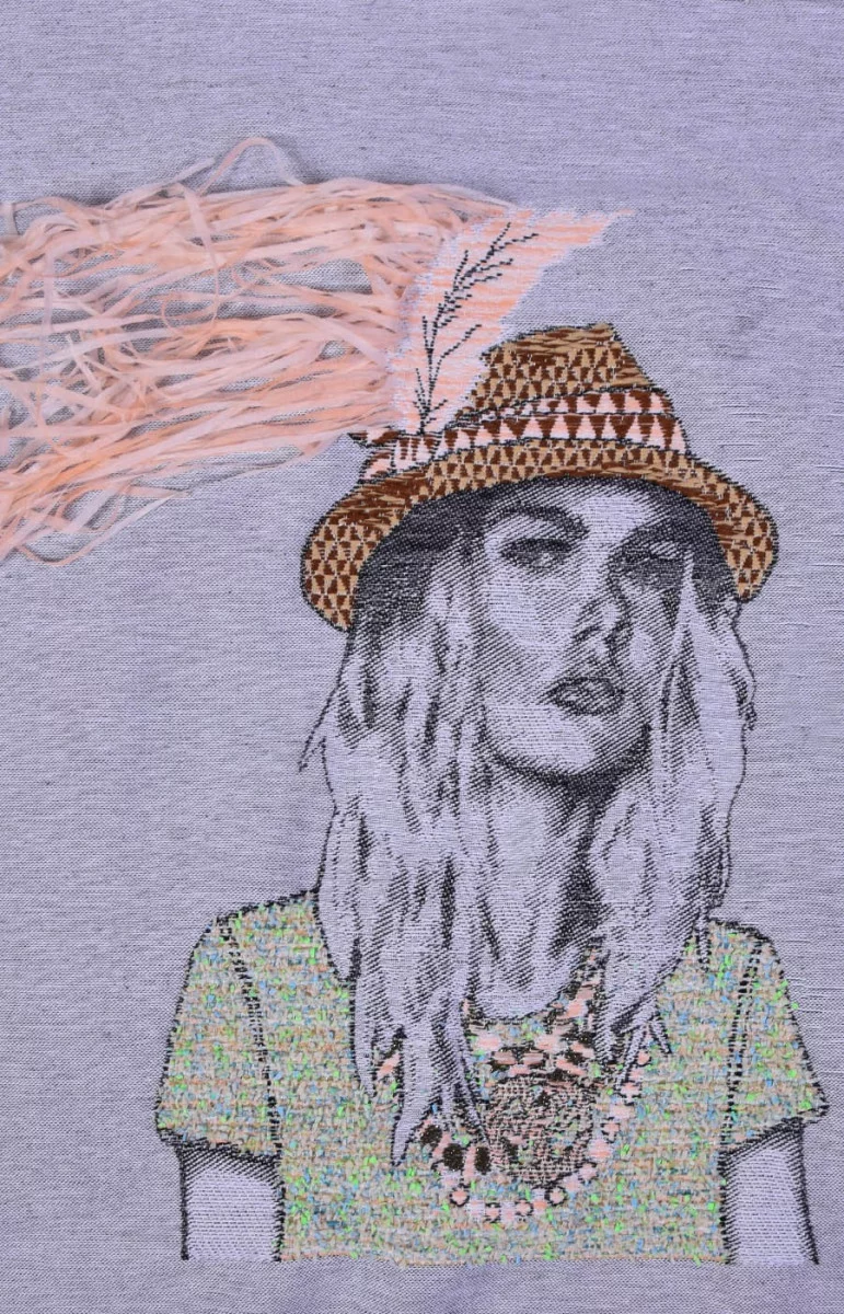 Itāļu žakarda austs audums kuponā 62cm plats un 70cm garš. Izgatavots vienkāršā austā ar lielu, izšūtu sievietes motīvu cepurē. Ļoti oriģināls materiāls, jo liela uzmanība ir pievērsta detaļām: blūzes motīvs ir dekorēts ar maziem pušķiem un imitē chanel audumu. Cepures spalva ir laša rozā krāsā, pagarināta ar garām bārkstīm, un figūra izskatās it kā kustībā. Audumu var izmantot kā oriģinālu detaļu kombinācijā ar citu materiālu, piemēram, kā sporta krekla "priekšpusi" vai jakas "aizmuguri". Tas būs lieliski piemērots arī kā rotājums, piemēram, spilvens.