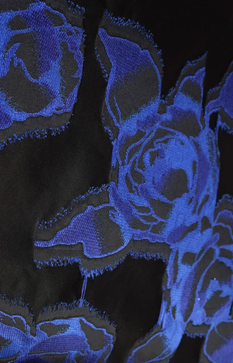 Itāļu žakarda kostīma audums ar lielu ziedu motīvu. Materiāls ar tafta struktūru melnā krāsā ar izšūtiem, lieliem ziedu rakstiem zilā krāsā - rudzupuķu. Raksti uz malām ir pabeigti ar smalkiem pušķiem, kas audumam piešķir strukturētu izskatu. Tas ir plāns, bet stīvs, ļoti plastisks. Tas ir lieliski piemērots elegantas kleitas, svārku vai kostīmu šūšanai.