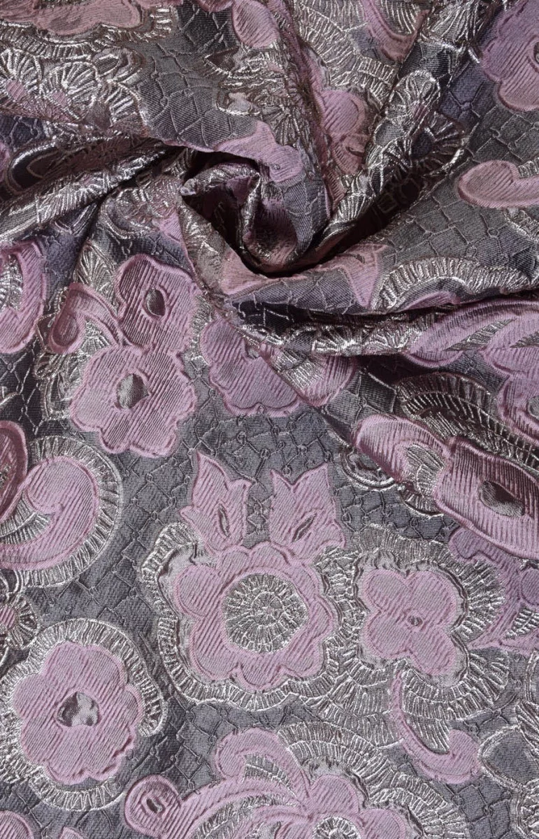 Ļoti bagāts žakarda kostīmu audums netīri rozā un zelta krāsā ar ziedu motīvu gar vienu malu - audums ir apšūts apkārt. Audums ir mīksts, neelastīgs, nedaudz caurspīdīgs.