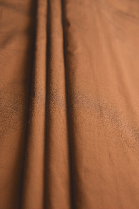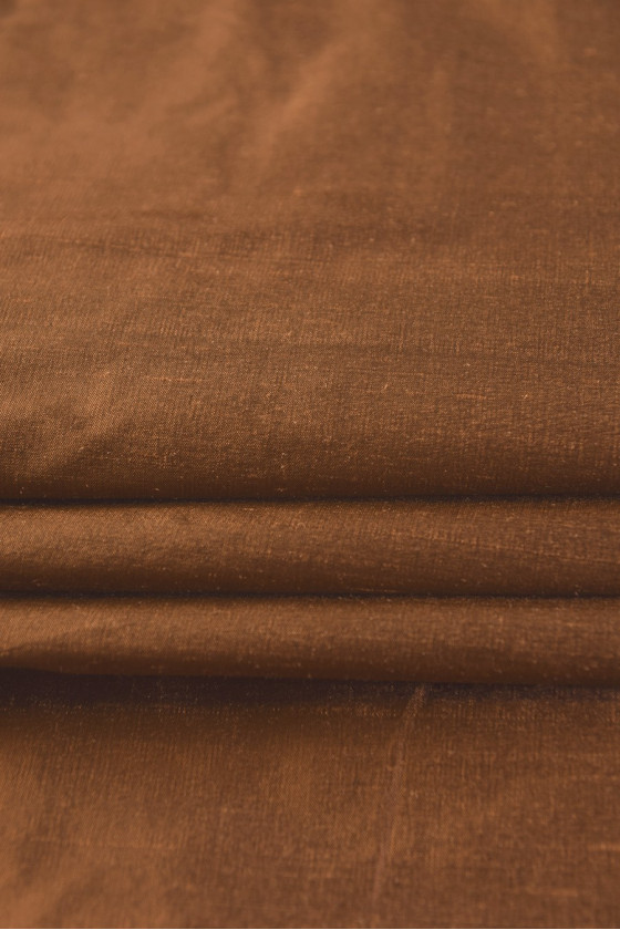 Divu toņu shantung zīds (melns un bēšs pavediens) brūnā krāsā (piena šokolāde) ar gludu struktūru, kas atgādina taftu, ir brīvi austs audums, krāsots dabiski. Tikai ķīmiskā tīrīšana!