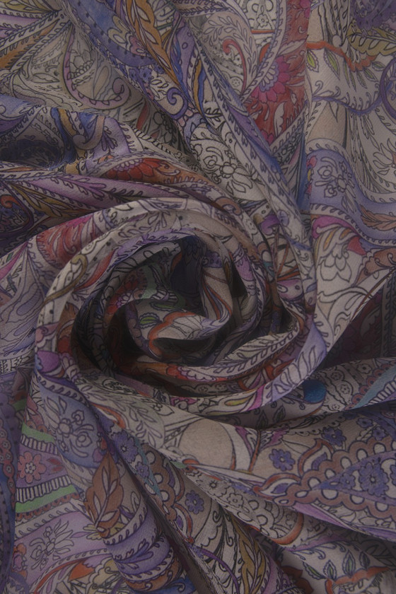 Zīda šifons ar austrumu paisley rakstu pulvera bēšā, pupiņas purpura-rozā-zaļā-oranžā krāsā. Audums ir pabeigts ar purpura rozā jostu apakšā. Tas ir ļoti delikāts, caurspīdīgs audums. Ideāli piemērots gaisīgām kleitām un blūzēm. Neelastīgs audums.
