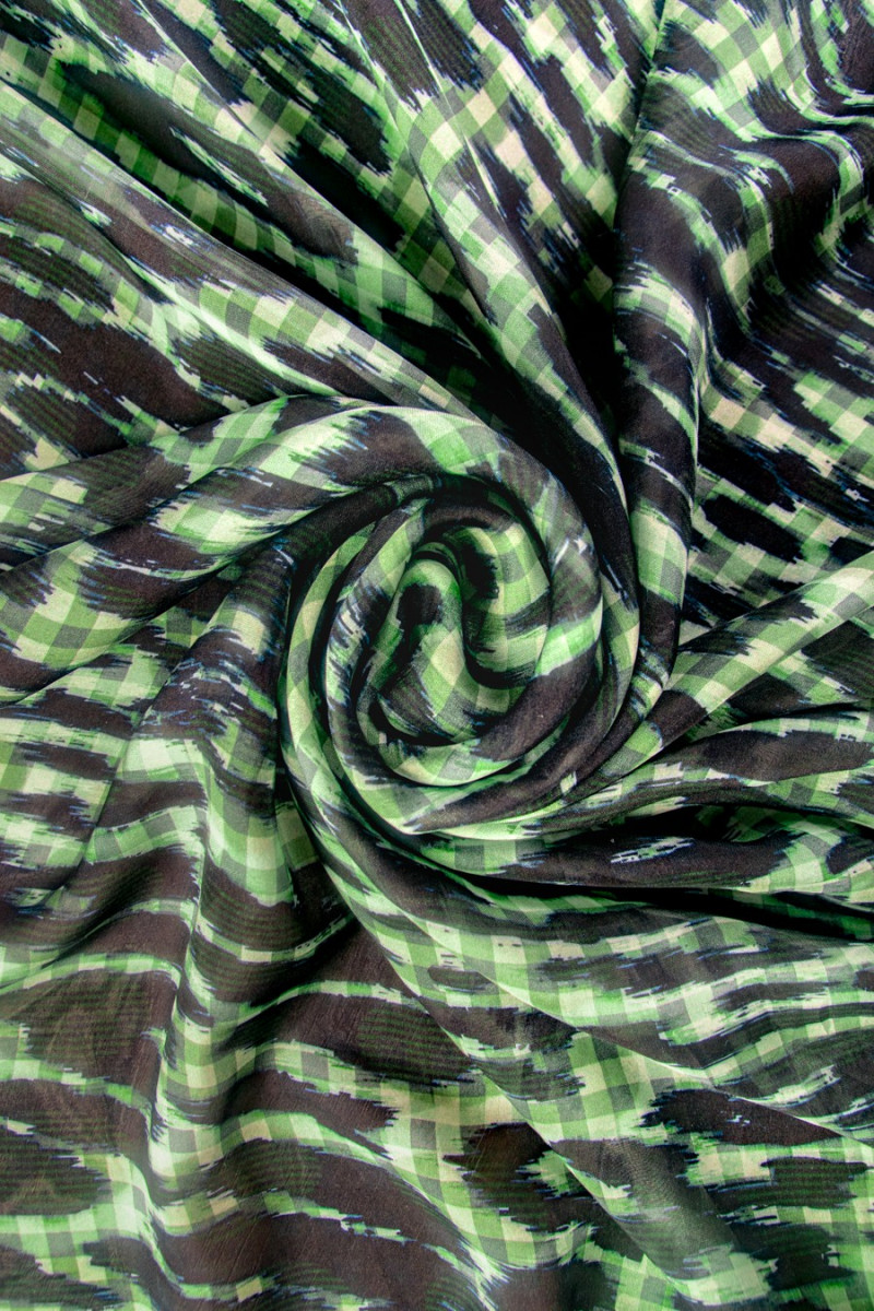 Zīda muslīns ar nelielu čeku melnu, zaļu un piparmētru ar melnu leoparda drukas rakstu. Muslīns ir daļēji caurspīdīgs, ļoti maigs pieskārienā, skaisti drapēts, tam ir maigs, cēls spīdums. Mēs iesakām to gaisīgu kleitu, tuniku, svārku šūšanai