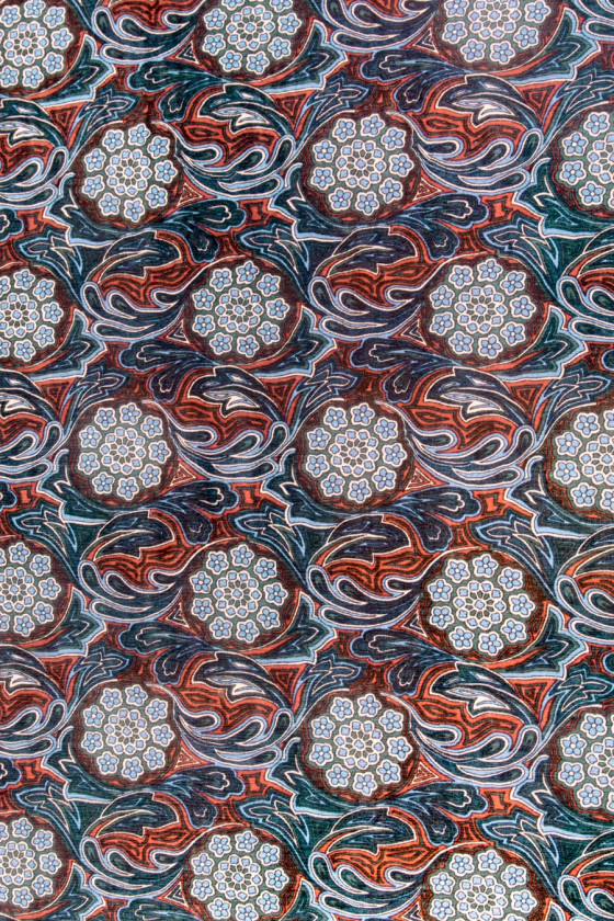 Krokains zīda šifons zilā, sarkanīgā un zaļā krāsā ar ecru ar maziem ziediem, ko ieskauj neregulārs etniskais raksts. Viegls, gaisīgs, smalks dabīgs materiāls, kas rūpnīcā sašķobīts vertikālā šļūdē. Audums piemērots kleitām, svārkiem, blūzēm, pareos. Šim šifonam ir nepieciešama odere vai spēcīga kroka.