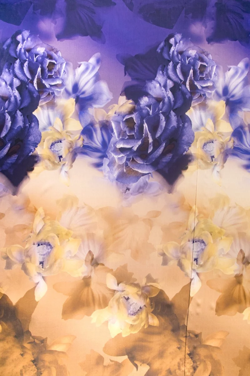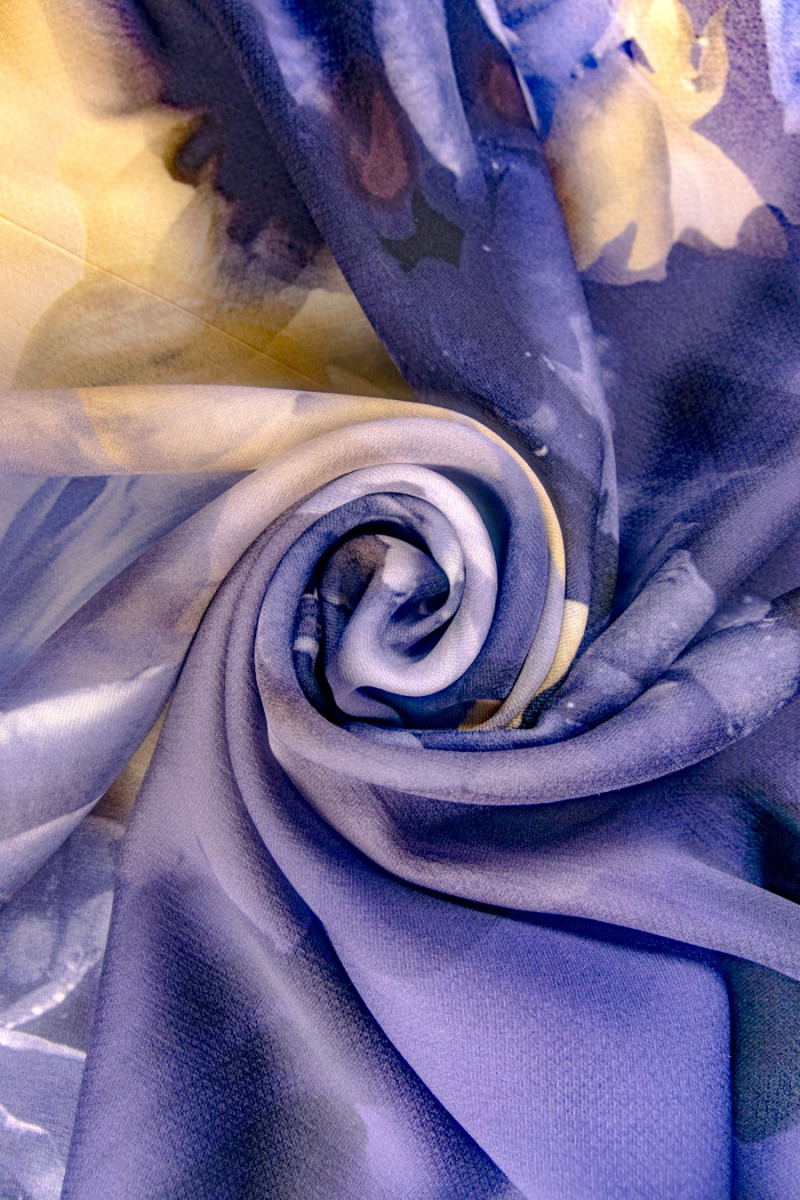 Zīda žoržets ar rakstu, kas aug no apakšas skaistos lielos ziedos purpura krāsā, kas iet cauri smilškrāsas krāsām līdz gaiši brūnai.