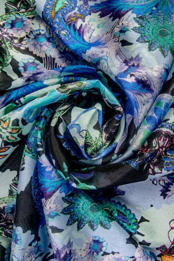 Elastīgs zīda kreps ar ziedu rakstu un austrumu lapām. Zilās rudzupuķu-oranžās-piparmētru krāsās tas ir maigs, plāns (nedaudz caurspīdīgs), daļēji matēts audums.