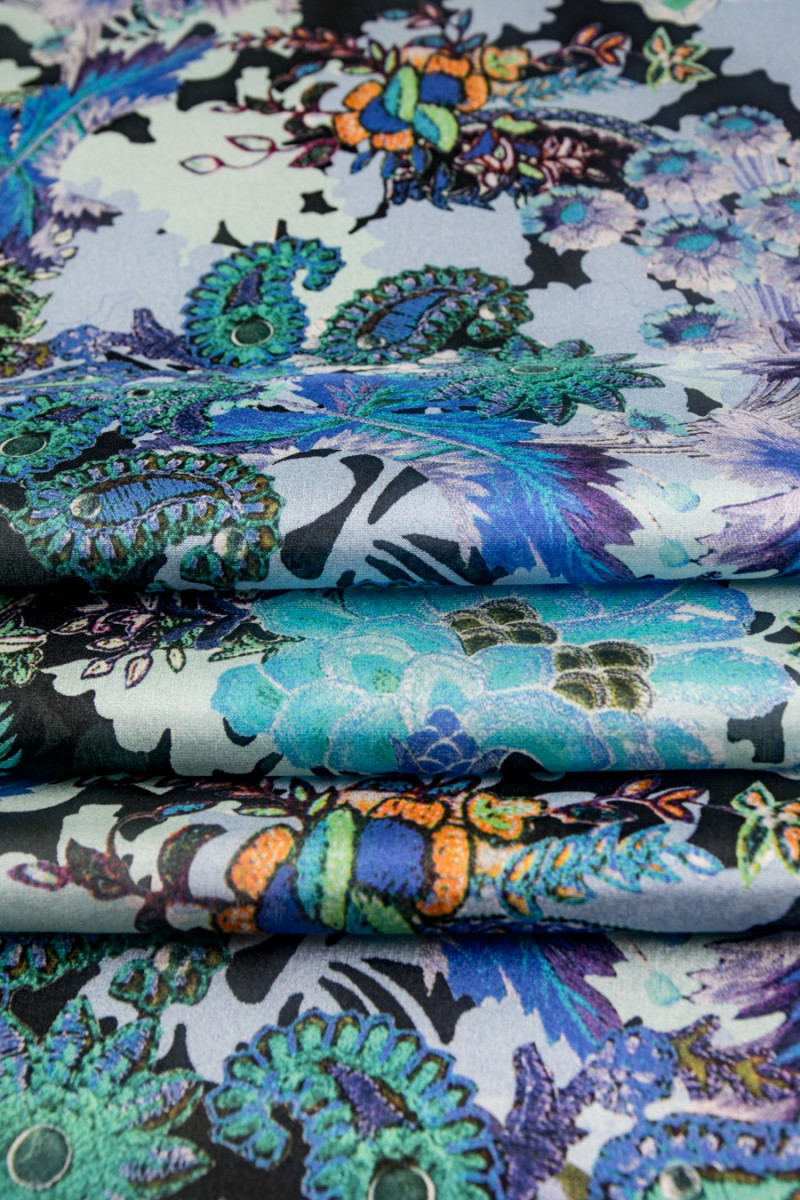 Elastīgs zīda kreps ar ziedu rakstu un austrumu lapām. Zilās rudzupuķu-oranžās-piparmētru krāsās tas ir maigs, plāns (nedaudz caurspīdīgs), daļēji matēts audums. To var izmantot, lai uzburtu gaisīgas kleitas, smalkas blūzes, šalles, šalles.