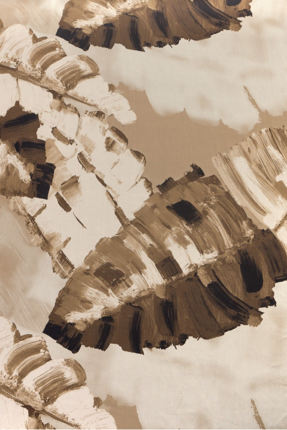 Zīda muslīns ar lielu, "krāsotu" rakstu bēšā, brūnā un haki krāsā, kas tiek atkārtots ik pēc 1 metra. Audums ir plāns, neelastīgs, 100% dabīgs zīds. Audums ir nedaudz caurspīdīgs, ļoti gaisīgs. Ideāli piemērots vasaras kleitām vai blūzēm. Mēs iesakām to vasaras kleitām, blūzēm, tunikas vai gariem svārkiem. Mēs iesakām izvēlēties pareizo muslīna oderi no oderējuma sadaļas vai cilnē uzrakstīt pasūtījumu: "pasūtīt oderi"
