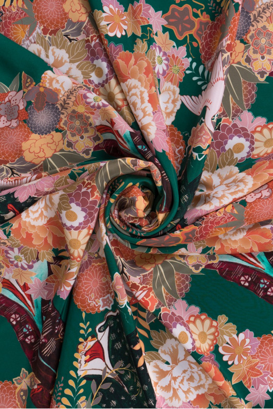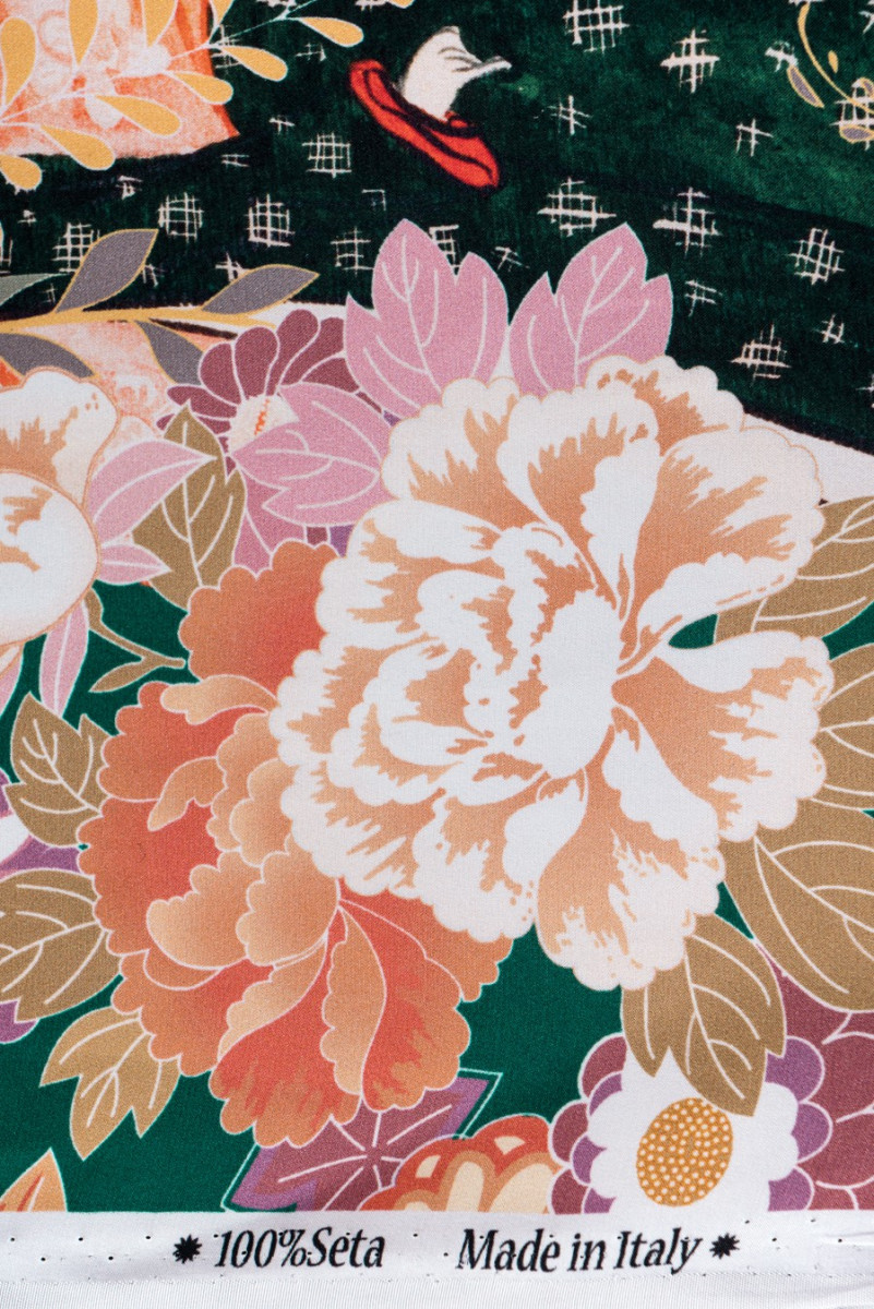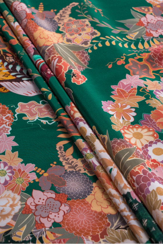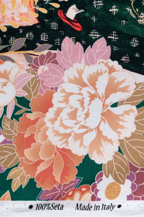 Itāļu 100% zīda audums ar pasteļziedu, putnu un apslēptu figūru motīvu, viss uz zaļa fona. Audums ir neelastīgs no satīna pakāpes, bet apdruka ir izgatavota matēta pusē. To var izmantot, lai uzburtu gaisīgas kleitas, smalkas blūzes, šalles, šalles.