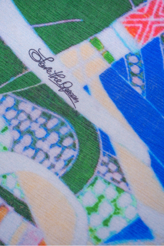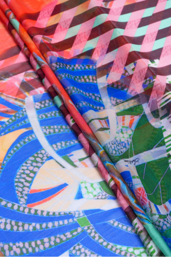 Itāļu zīda šifons krokots ar krāsainu, izdomātu ziedu un ģeometrisku motīvu. Audumam ir kupons ar izmēriem 105 cm* 135 cm. Plāns, caurspīdīgs audums - nepieciešama odere. Lieliski piemērots gaisīgas kleitas, svārku, blūzes, šalles šūšanai. Sastāvs: 100% dabīgs zīds G
