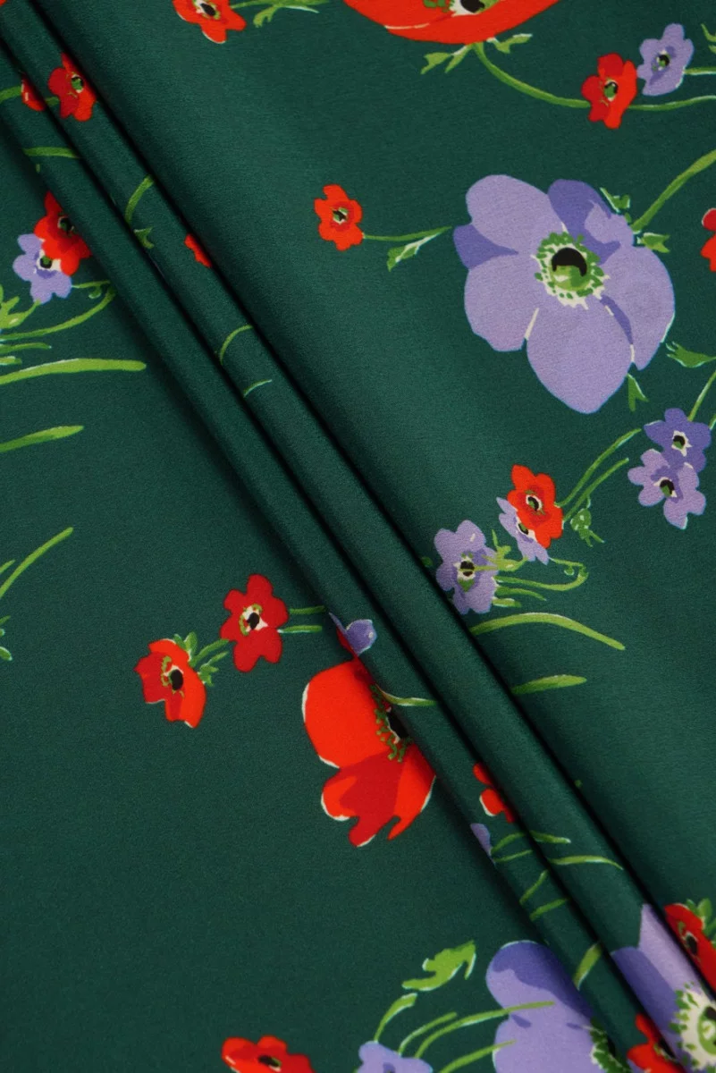 Itāļu zīda kreps ar ziedu pušķu motīvu oranžās un viršu krāsās, uz zaļas pudeles fona. Zīda kreps ir smalks, plāns, daļēji matēts audums. To var izmantot, lai uzburtu gaisīgas kleitas, smalkas blūzes, šalles, šalles.