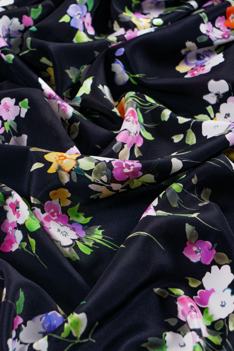 Itāļu 100% zīda kreps melnā krāsā ar krāsainu ziedu motīvu. Zīda kreps ir smalks, plāns, daļēji matēts audums. To var izmantot, lai uzburtu gaisīgas kleitas, smalkas blūzes, šalles, šalles.