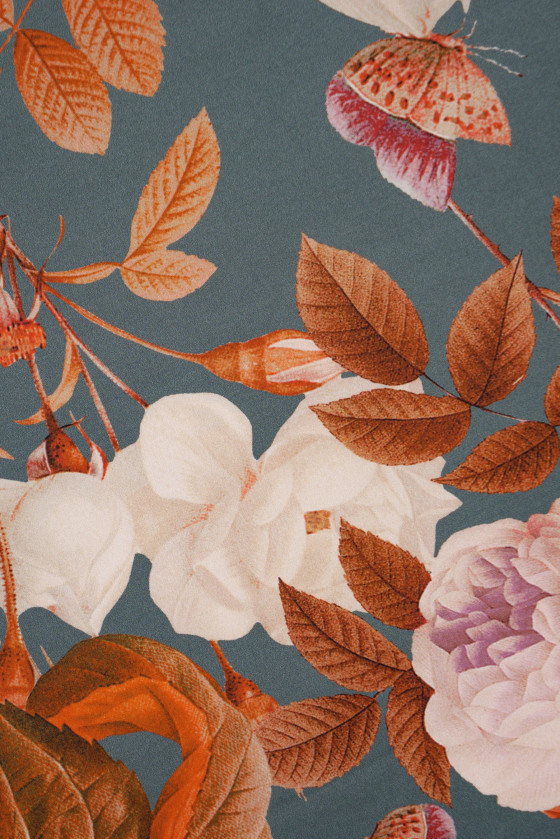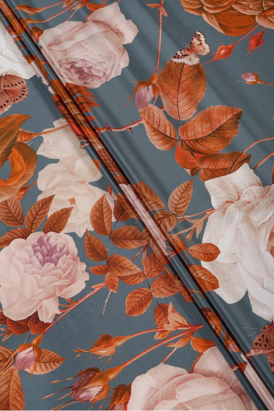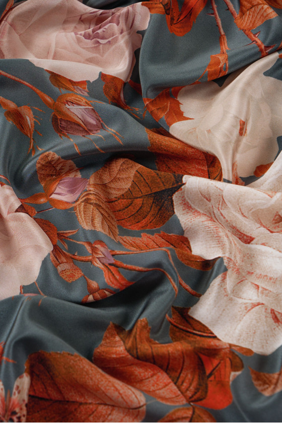 Itāļu 100% zīda kreps pelēkzaļā krāsā ar lielu, sarkanu ziedu motīvu. Zīda kreps ir smalks, plāns, daļēji matēts audums.