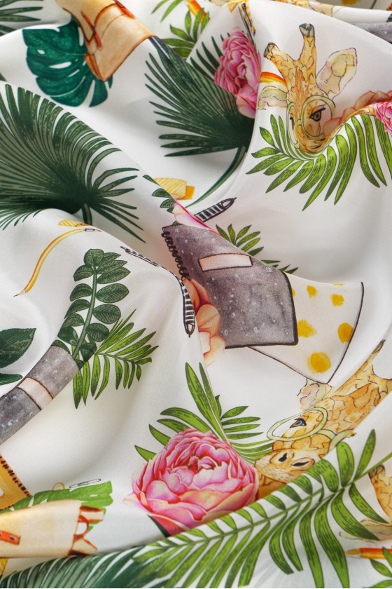 Itāļu 100% habotai zīda audums écru krāsā ar žirafes, ziedu, lapu un piezīmju grāmatiņu motīvu. Plāns, ļoti delikāts, caurspīdīgs audums (nepieciešama odere), matēts - lieliski piemērots gaisīgas blūzes, kleitas, svārku vai šalles šūšanai.