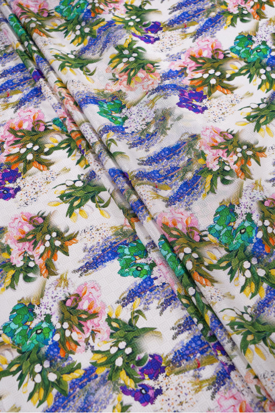Skaists, itāļu 100% zīda audums krēmkrāsā ar krāsainu ziedu pušķu motīvu. Audums ar ļoti oriģinālu žakarda austu matēti spīdīga kuba formā. Neelastīgs, viegls, necaurspīdīgs audums ar maigu spīdumu - lieliski piemērots elegantas kleitas, blūzes, svārku vai šalles šūšanai.