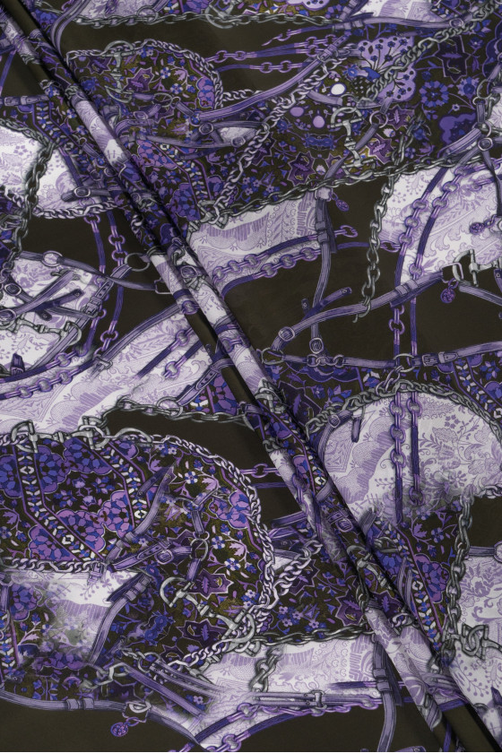 Itāļu, biezāks šifons 100% zīds ar pelēku un violetu ķēžu motīvu uz ļoti tumši zaļa fona. Šifons, kas izgatavots no dabīgā zīda, ir ļoti maigs, gaisīgs, nedaudz caurspīdīgs audums. Ideāli piemērots gaisīgām kleitām un blūzēm. Neelastīgs audums.