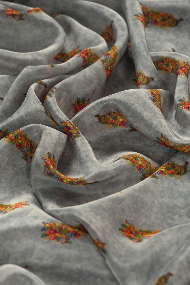 Itāļu kreps 100% zīds ar "Cornucopia" motīvu (6 cm) uz pelēka fona. Zīda kreps ir maigs, plāns, daļēji matēts audums.