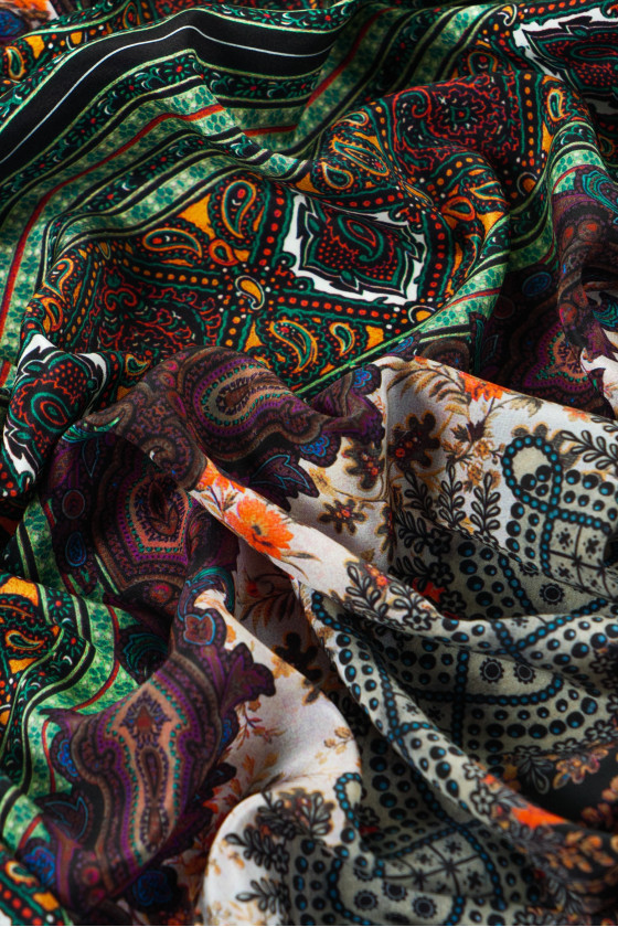 Itāļu 100% zīda kreps kupona izmērā 135 cm* 140 cm. Interesants ziedu un austrumu motīvu apvienojums rudens krāsās. Zīda kreps ir smalks, plāns, daļēji matēts audums. Tas ir mīksts uz tausti un ļoti labi iederas. To var izmantot, lai uzburtu gaisīgas kleitas, smalkas blūzes, svārkus, šalles, šalles.