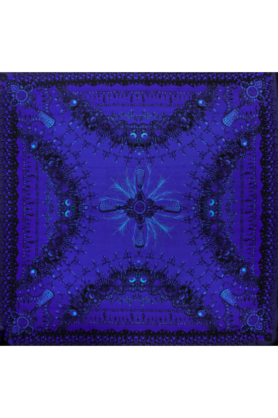 Itāļu muslīns 100% zīds kuponā ar izmēriem 135 cm* 140 cm. Skaists dārgakmeņu motīvs šalles formā melnā un rudzupuķu krāsā.