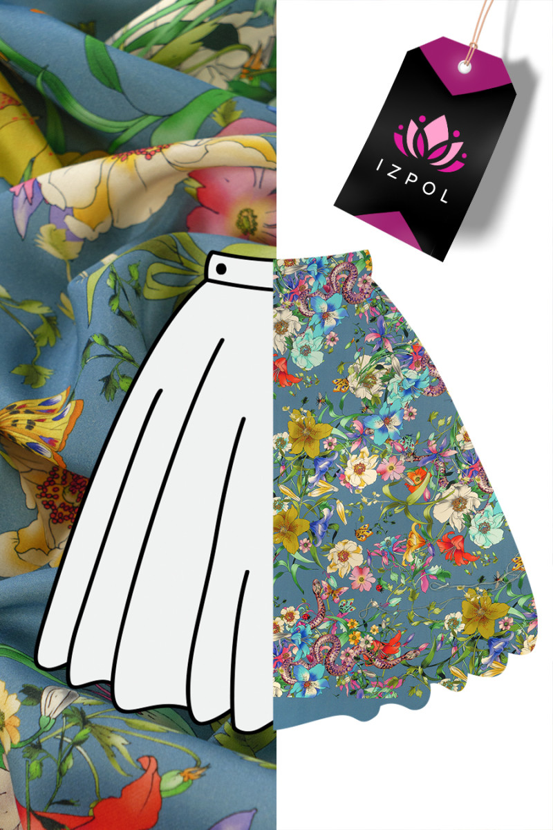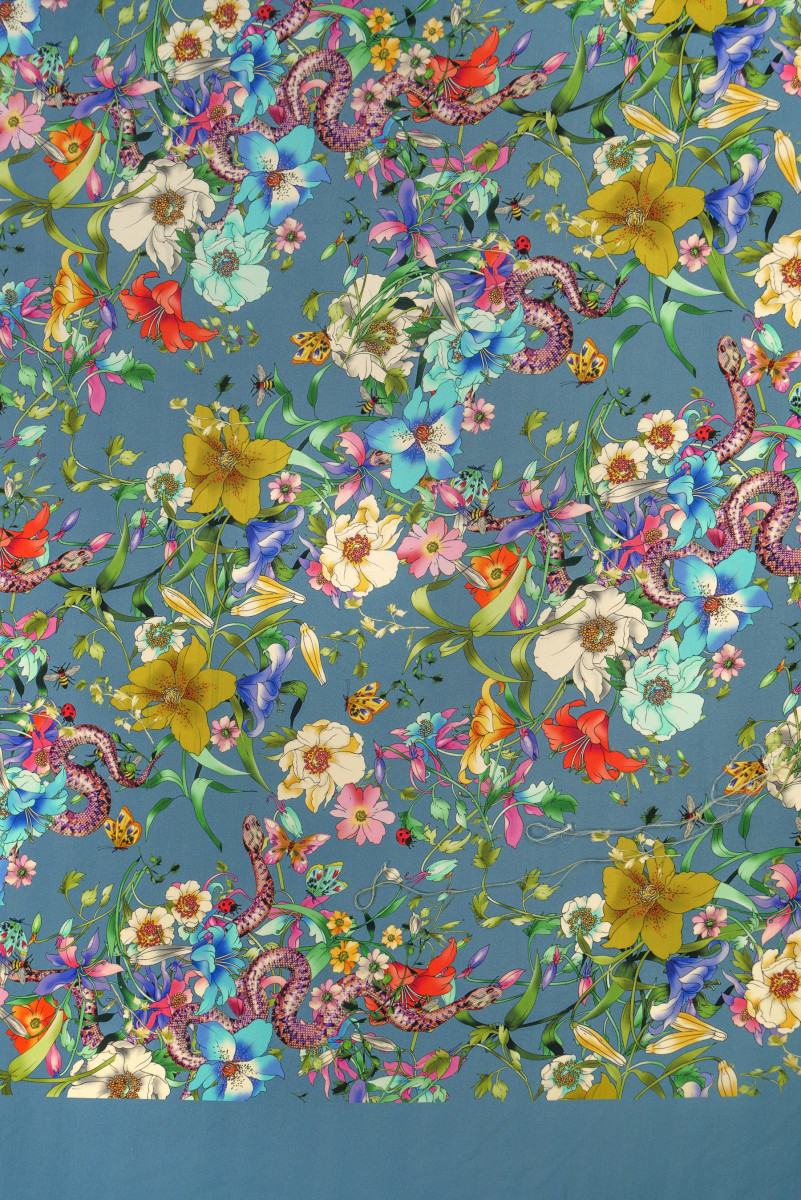Itāļu kadi kleitas audums, kas austs no sojas šķiedrām un dabīgā zīda. Skaists ziedu, tauriņu un čūskas motīvs uz pelēkzila fona, audums vienā pusē ir pabeigts ar gludu, 15 cm platu apmali - mēs to šujam apkārtmēr.