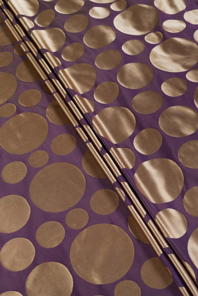 Itāļu 100% zīda tafta audums purpursarkanā krāsā ar neregulāru, smilškrāsas punktu motīvu (no 4 - 11 cm) - var šūt no abām pusēm (apgrieztās krāsas). Dabīgā zīda tafts ir plāns, bet stingrs audums ar smalku spīdumu, kas raksturīgs zīda audumiem. Ideāli piemērots kleitas, svārku šūšanai vai dekoratīviem nolūkiem.