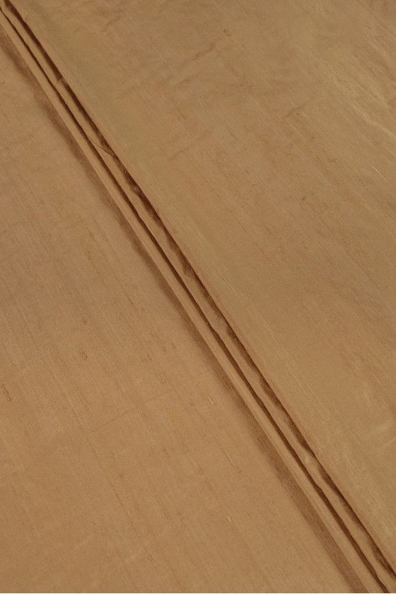 Itāļu 100% shantung zīda audums zeltaini bēšā. Shandung ir mīksta zīda auduma veids, kas izgatavots no neapstrādātas dzijas, ar raksturīgiem neregulāri sadalītiem, vienkrāsainiem sabiezējumiem (dekoratīvi vītņota dzija) audumā. Tam ir nedaudz stingra, plastmasas struktūra.