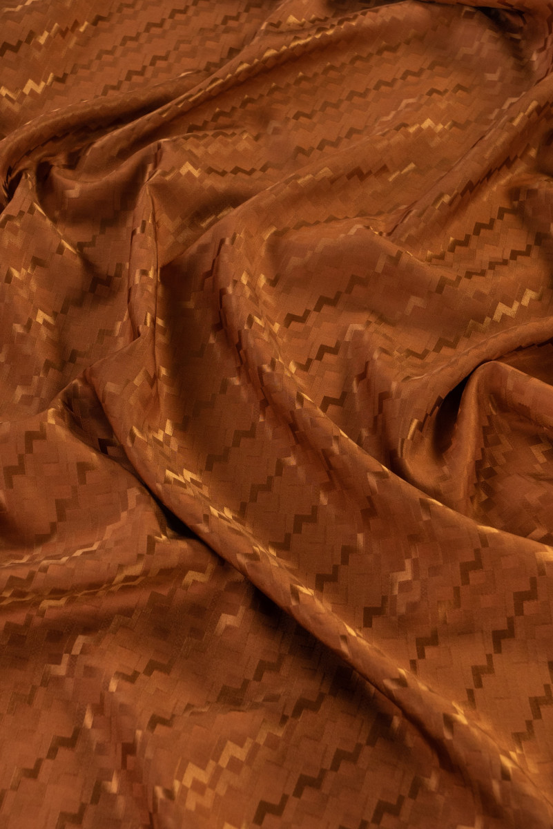 Itāļu 100% zīda audums sarkanā krāsā, žakarda austs audums ar zigzaga motīvu, kas sakārtots pa diagonāli. Neelastīgs audums, plāns, bet necaurspīdīgs, viegls ar zīda audumiem raksturīgu spīdumu. Ideāli piemērots krekla, blūzes, brīvu svārku, kleitas vai šalles šūšanai.
