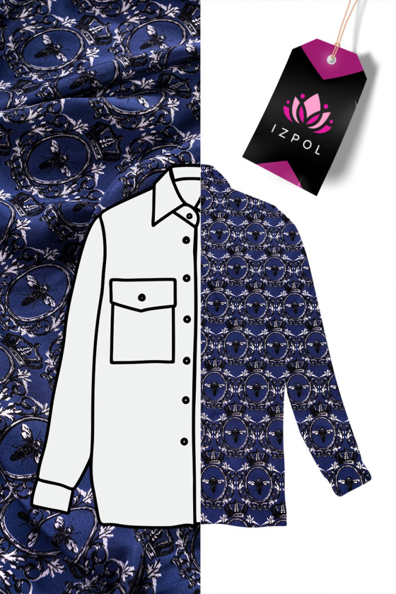 Itāļu 100% zīda sarža audums tumši zilā krāsā ar priekšgala sarža motīvu vainagā baltā un melnā krāsā (motīvs ir 8 cm liels). Zīda sarža pinums ir audums ar sarža pinumu, mīksts, ļoti izturīgs, maigi stīvs, lai tas derētu. Lieliski piemērots krekla, kleitas, svārku vai šalles/šalles šūšanai.
