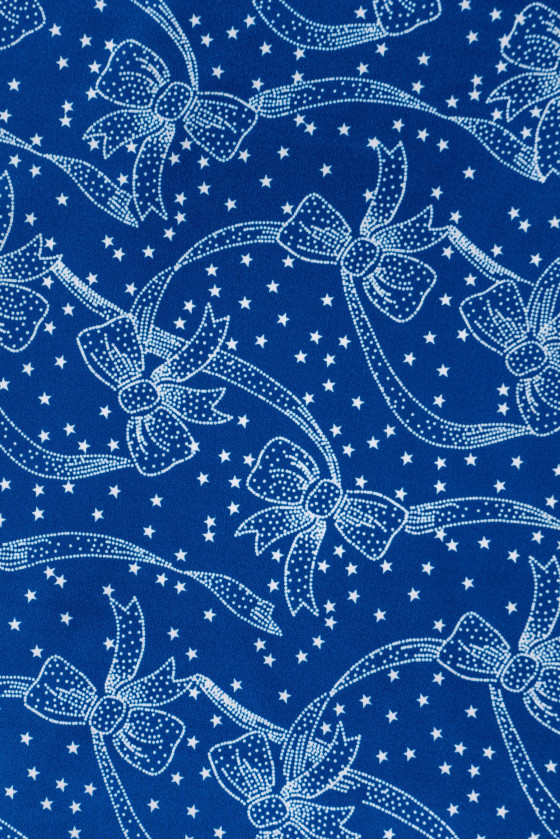 Itāļu 100% zīda satīns zilā krāsā ar pelēku un baltu loku un mazu zvaigžņu motīvu. Zīda satīns ir blīvs un viegls audums ar plakanu virsmu, kas izgatavots satīna austā. Papildu priekšrocība ir tā gludums un izturība, kā arī tas, ka tas ļoti labi iederas, neparādās cauri un ir patīkams pieskarties. No vienas puses, tas ir matēts, un, no otras puses, tas ir cēli spīdīgs. To var izmantot, lai uzburtu gaisīgas kleitas, smalkas blūzes, svārkus, šalles, šalles.