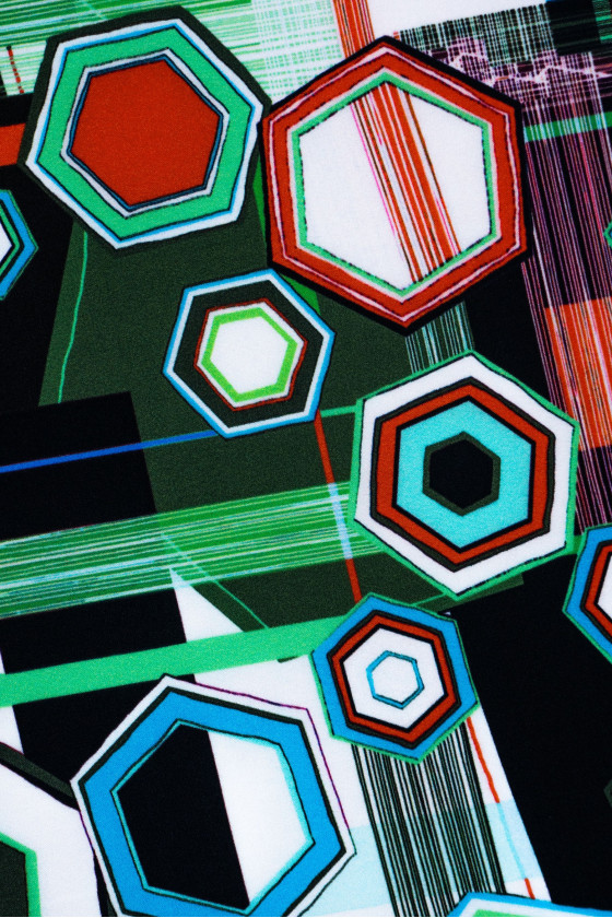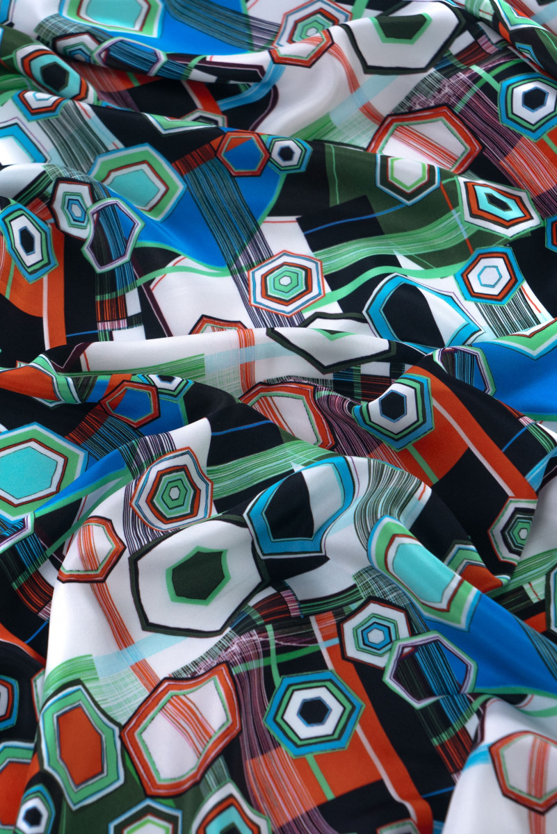 Itāļu 100% zīda satīns ar ģeometriskiem rakstiem 3 - 7 cm zaļā, zilā un oranžā krāsā - apdruka ir izgatavota uz matētas puses. Zīda satīns ir blīvs un viegls audums ar plakanu virsmu, kas izgatavots satīna austā. Papildu priekšrocība ir tā gludums un izturība, kā arī tas, ka tas ļoti labi iederas, neparādās cauri un ir patīkams pieskarties. No vienas puses, tas ir matēts, un, no otras puses, tas ir cēli spīdīgs. To var izmantot, lai uzburtu gaisīgas kleitas, smalkas blūzes, svārkus, šalles, šalles.