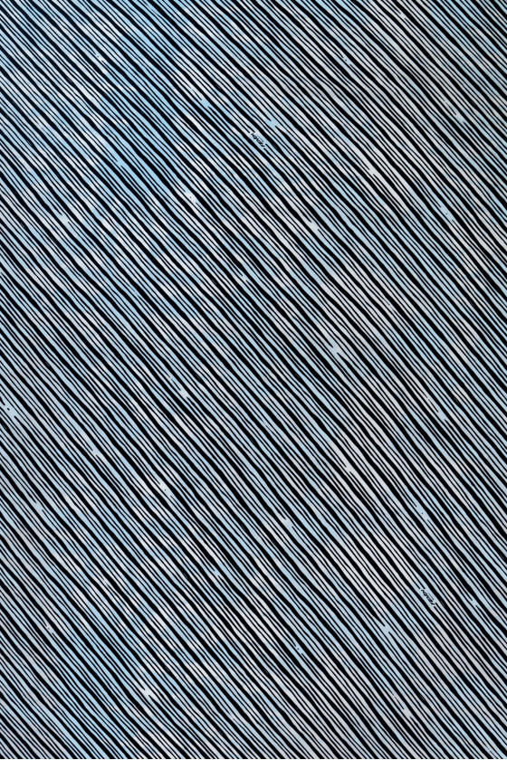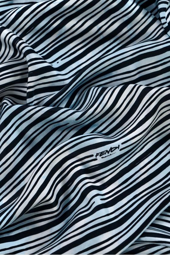 Itāļu 100% zīda sarža audums ar melnām, šķērsvirziena svītrām uz iekrāsota fona zilā un krēmkrāsā. Audums ir parakstīts ar pazīstama modes nama nosaukumu.