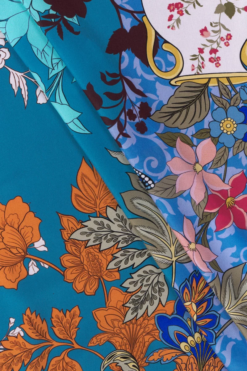 Itāļu 100% zīda kreps kuponā ar izmēriem 130 cm* 140 cm ar somu, apavu, vāžu un lapu motīvu uz jūras fona. Zīda kreps ir smalks, plāns, daļēji matēts audums. Tas ir mīksts uz tausti un ļoti labi iederas. To var izmantot, lai uzburtu gaisīgas kleitas, smalkas blūzes, svārkus, šalles, šalles.