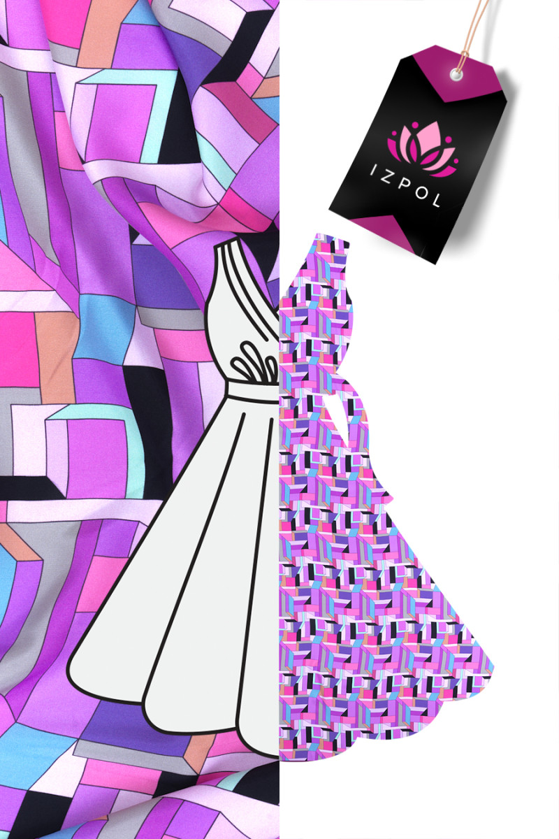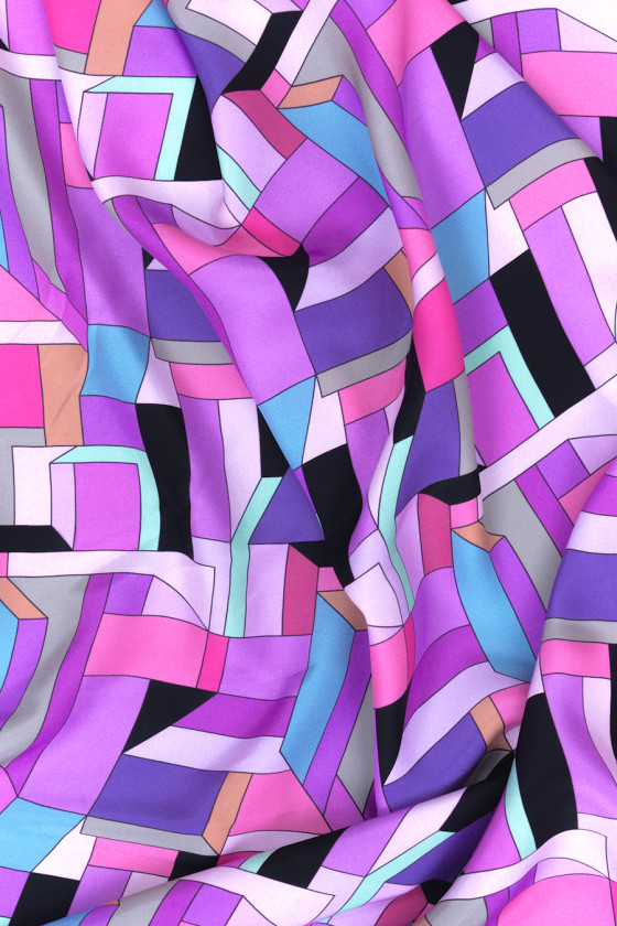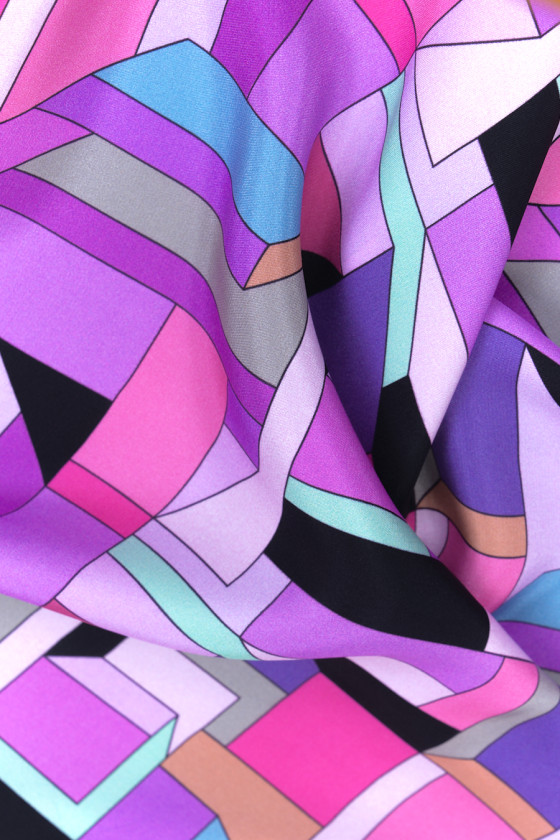 Itāļu satīns 100% zīds ar smalku ģeometrisku rakstu. Ļoti interesanta rozā, purpura, krējuma, piparmētru, fuksijas un melnās krāsas kombinācija, kas rada mazus, neregulārus ģeometriskus rakstus. Viss tiek turēts ļoti "pozitīvā" krāsu shēmā, turklāt apdruka tika izgatavota uz matētas puses, tāpēc audums tikai nedaudz spīd. Fantastisks piedāvājums trakām personībām, kurām patīk izcelties.