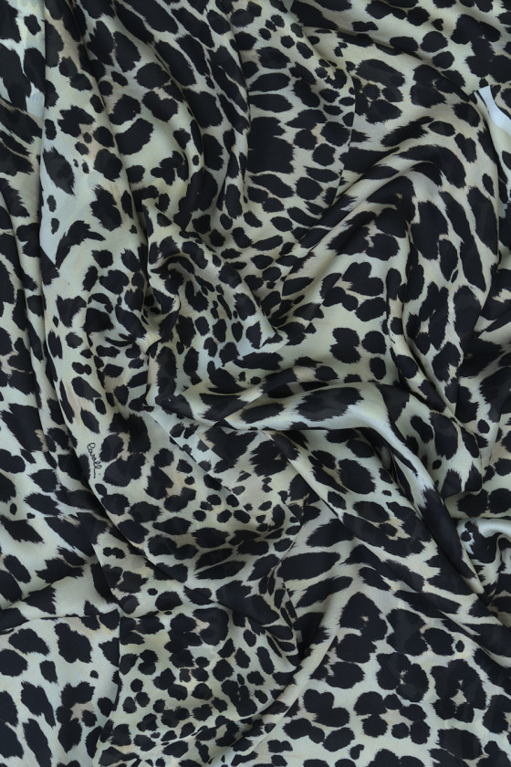 Itāļu muslīns 100% zīds kupona izmērā 130 cm* 120 cm. Klasiska leoparda apdruka bēšā, brūnā un melnā krāsā. Audums dizaineru apģērbu faniem, jo tas ir parakstīts ar pazīstama modes dizainera vārdu.
