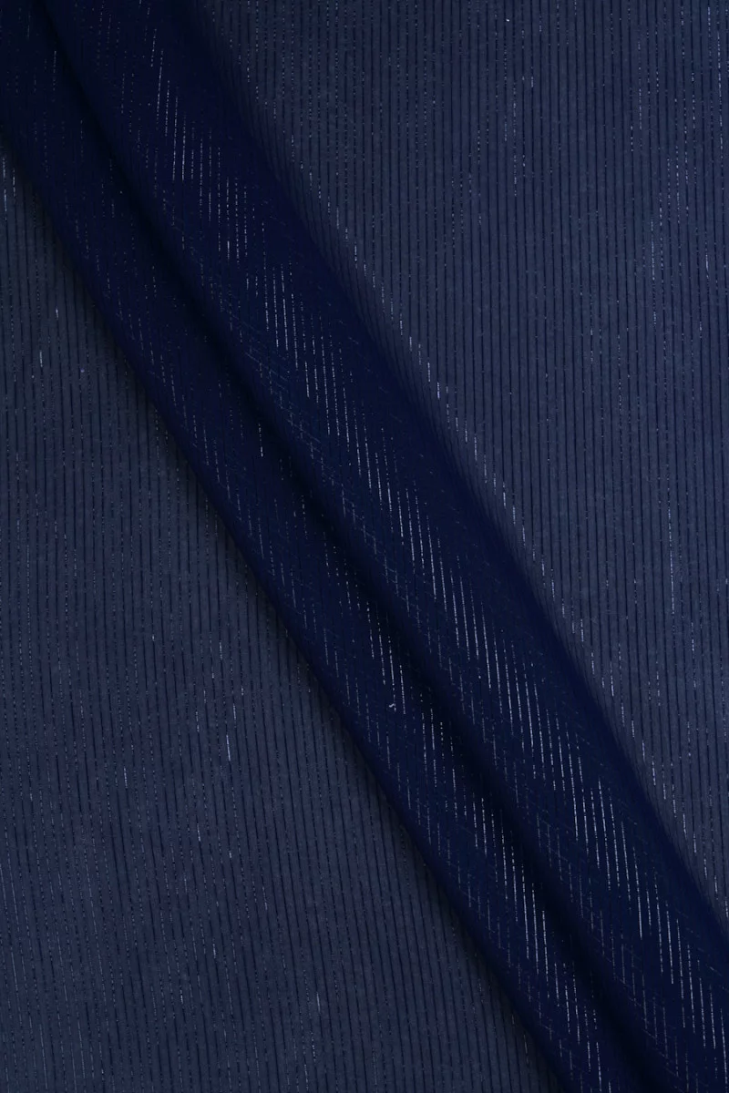 Itāļu 100% zīda muslīns tumši zilā krāsā, dekorēts ar lurex diegu tajā pašā krāsā. Dekoratīvais pavediens rada ļoti mazas, vertikālas svītras. Audums ir plāns un caurspīdīgs, maigi spīdīgs, pateicoties lurex. Tas ir lieliski piemērots eleganta krekla, blūzes, svārku vai kleitas šūšanai. Fantastisks piedāvājums klasisko rakstu un krāsu faniem, bet ar nedaudz modernu vērpjot.