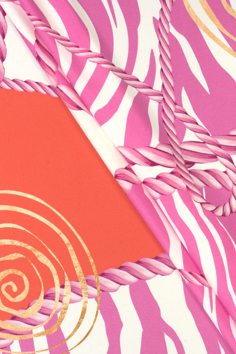 Itāļu zīda satīns ar elastāna pievienošanu ar apdruku, kas izgatavota no matētas puses. Ļoti interesants lielu asaru pilienam līdzīgu rakstu motīvs, kas piepildīts ar rozā un krēmkrāsas zebras motīvu. Visu papildina rozā stīgas un zelta ķēdes, kas pabeigtas ar lieliem gliemežiem. Fonu veido plašas, vertikālas svītras krēmā un oranžā krāsā. Audums ir ļoti oriģināls skaistās vasaras krāsās. Elastāna pievienošana padara to ērtāku valkāšanai un mazāk grumbām. Tas ir lieliski piemērots oriģināla krekla, kleitas vai svārku šūšanai.