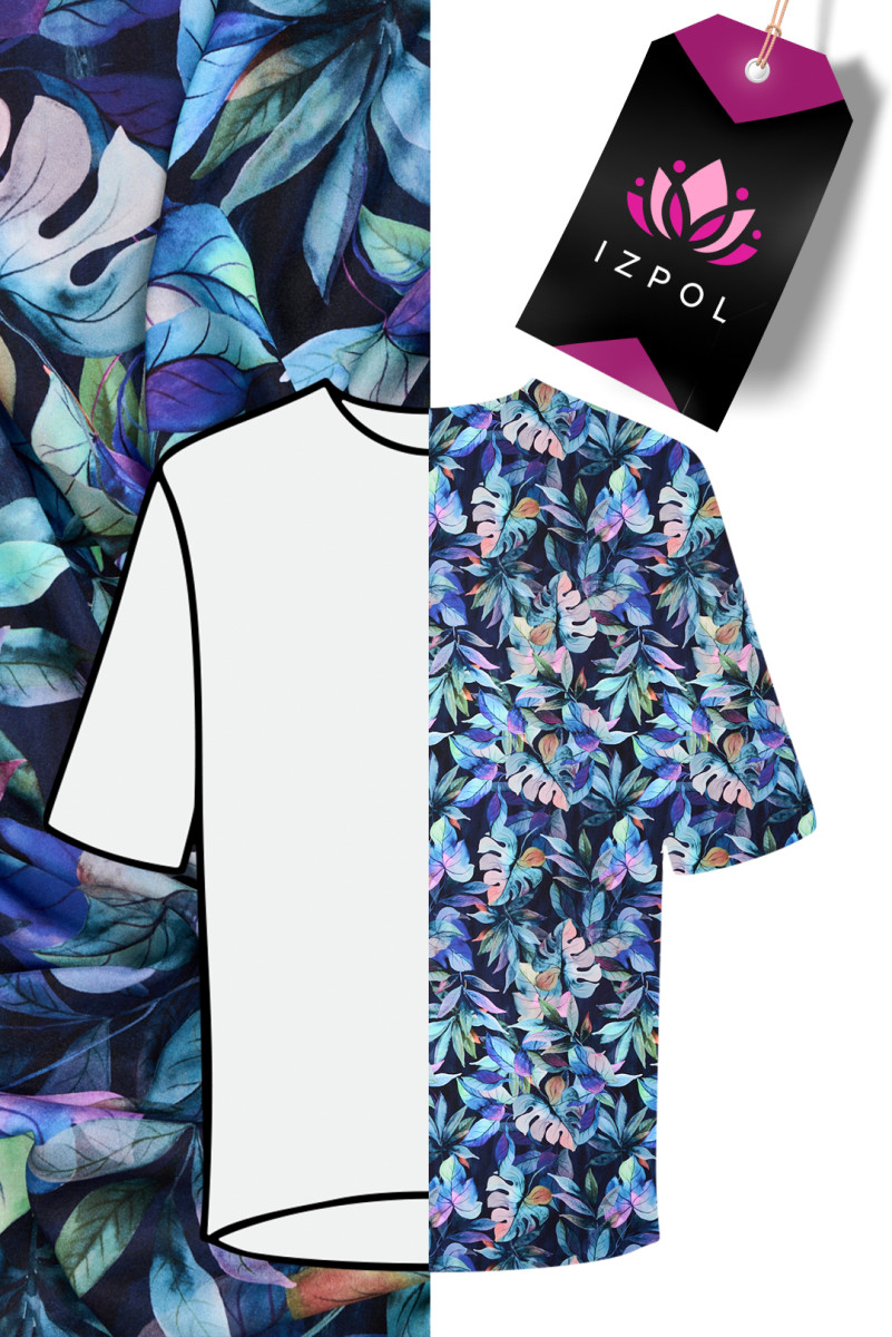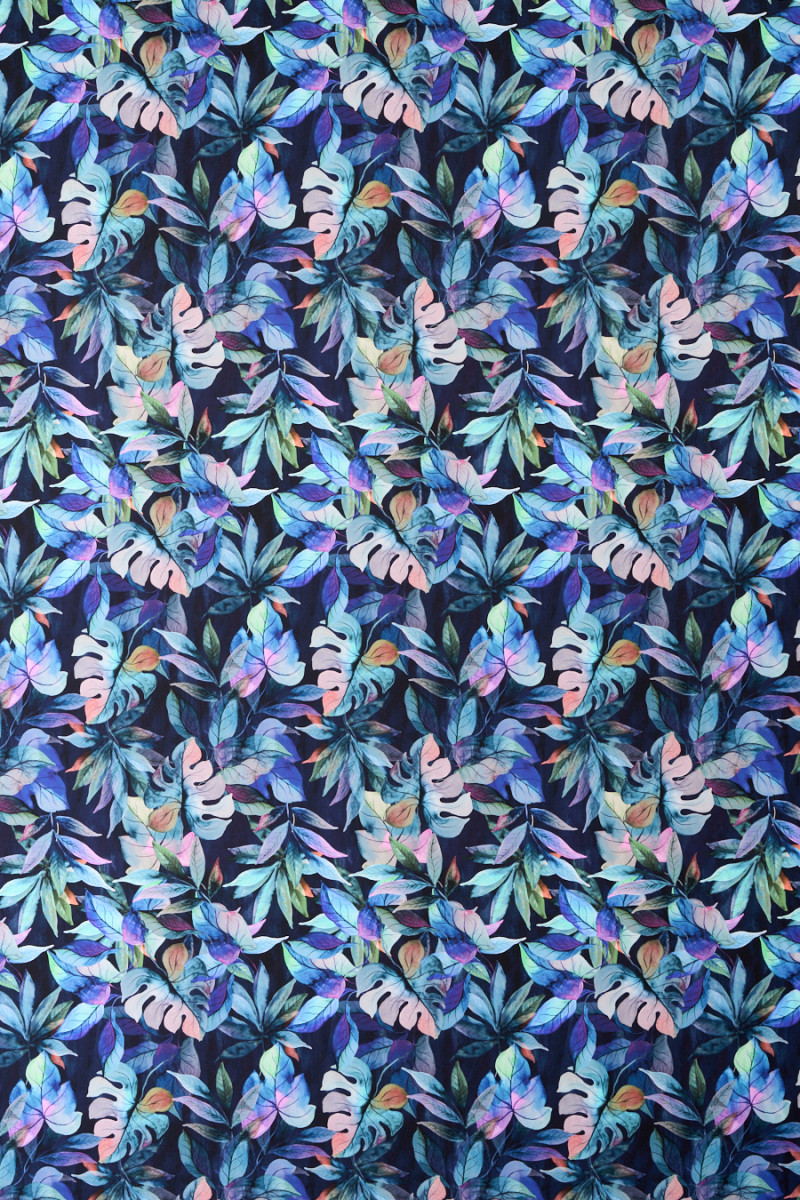 Itāļu zīda satīns ar elastāna pievienošanu ar krāsainu lapu motīvu uz iekrāsota melna un tumši zila fona. Raksts ir izgatavots no jūras un zaļām krāsām, skaisti bagātināts ar neona akcentiem purpursarkanā, rozā un zaļā krāsā. Audums ir mīksts, elastīgs un skaisti pieguļ. Drukāts uz matētas puses. Tas ir lieliski piemērots oriģināla krekla, kleitas vai svārku šūšanai.