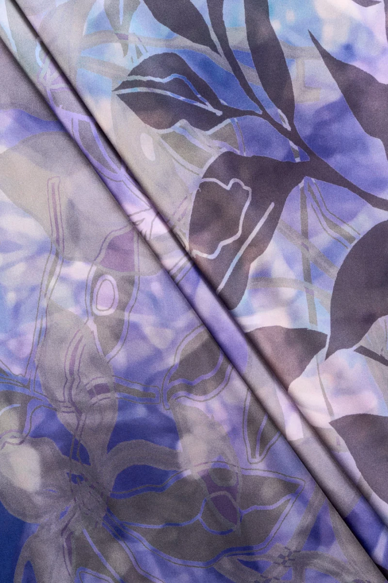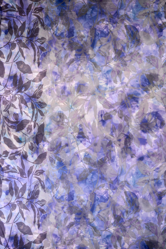 Itāļu zīda satīns ar elastāna pievienošanu uz iekrāsota purpura zila fona ir neskaidras pelēkas lapas, kas asina gar vienu malu. Modelis ir papildus bagātināts ar akcentiem ļoti gaiši violetā krāsā, kas maigi apgaismo visu materiālu. Audums ir mīksts, elastīgs un skaisti pieguļ. Ideāls piedāvājums vājās krāsās cilvēkiem, kuriem patīk elegantas un mūžīgas krāsu kombinācijas.