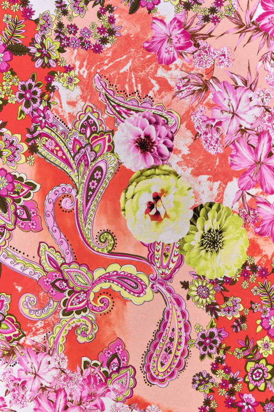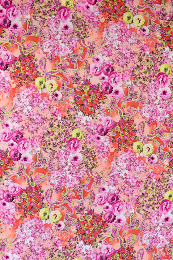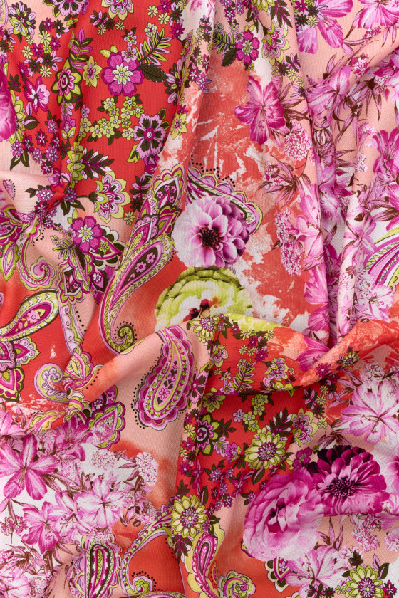 Itāļu 100% zīda audums ar ļoti smalku žakarda austu. Bagātīgs, ziedu raksts, ko papildina paisley motīvi, visi oranžā, rozā un laima krāsā. Audums ir ļoti viegls, neelastīgs, mīksts, nedaudz caurspīdīgs. Tas ir lieliski piemērots vasaras drēbēm, piemēram, kleitām, svārkiem, blūzēm vai pareos.