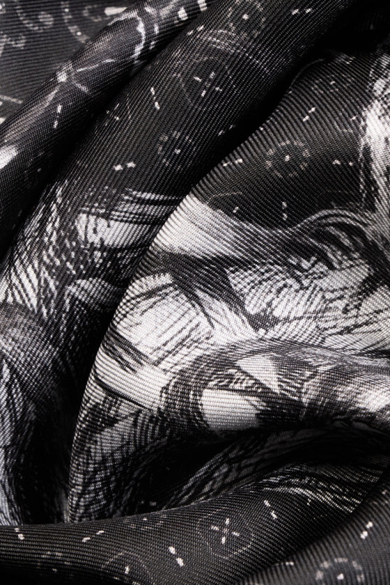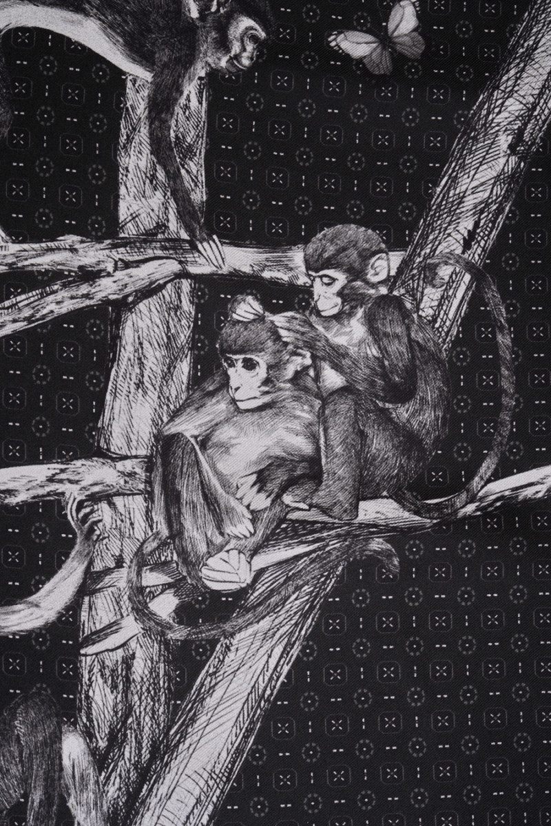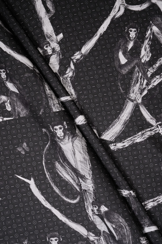 Itāļu 100% zīda sarža pinuma audums ar pelēku pērtiķu motīvu uz grafīta fona, kas piepildīts ar nelielu rakstu. Audums ir 230 cm garš kupons un sastāv no gataviem elementiem, kas jāsagriež. Materiāls ir plāns, bet necaurspīdīgs ar smalku sarža pinumu, neelastīgs un nāk no pazīstamas modes nama kolekcijas. Fantastisks piedāvājums dzīvnieku dizaina faniem, kas meklē oriģinalitāti un neparastumu.