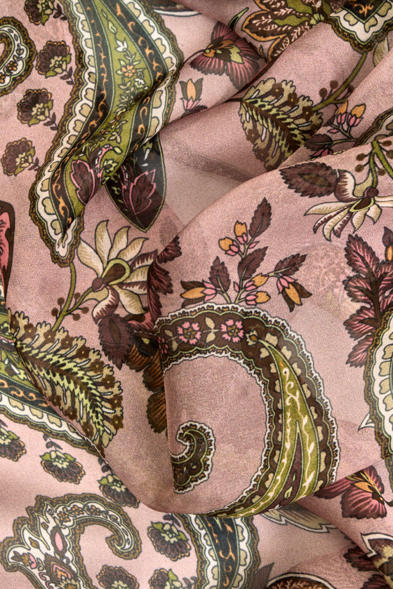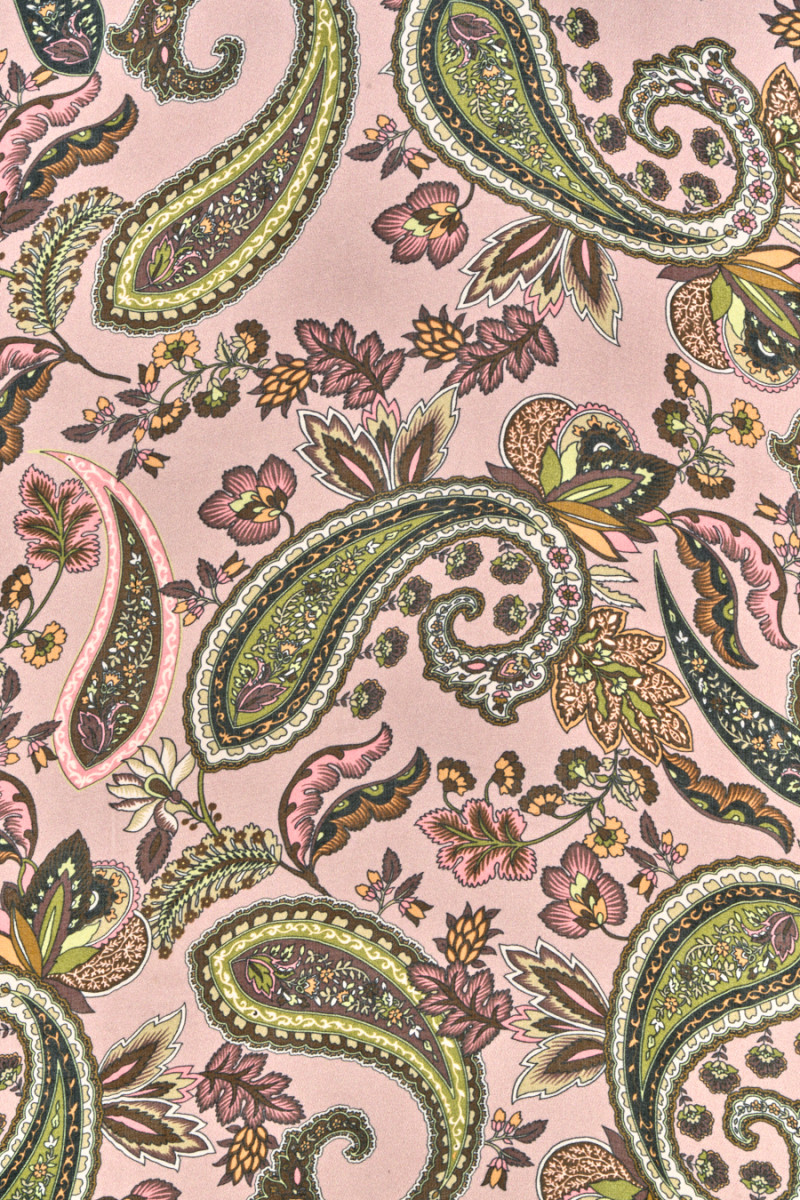 Itāļu audums, kas austs no dabīga zīda un viskozes ar zaļiem paisley motīviem, oranžiem un rozā ziedu elementiem uz netīra, rozā fona. Audums ir ļoti viegls, gaisīgs, caurspīdīgs, maigs un neelastīgs. Lielisks piedāvājums kleitām, svārkiem, blūzēm un šallēm.