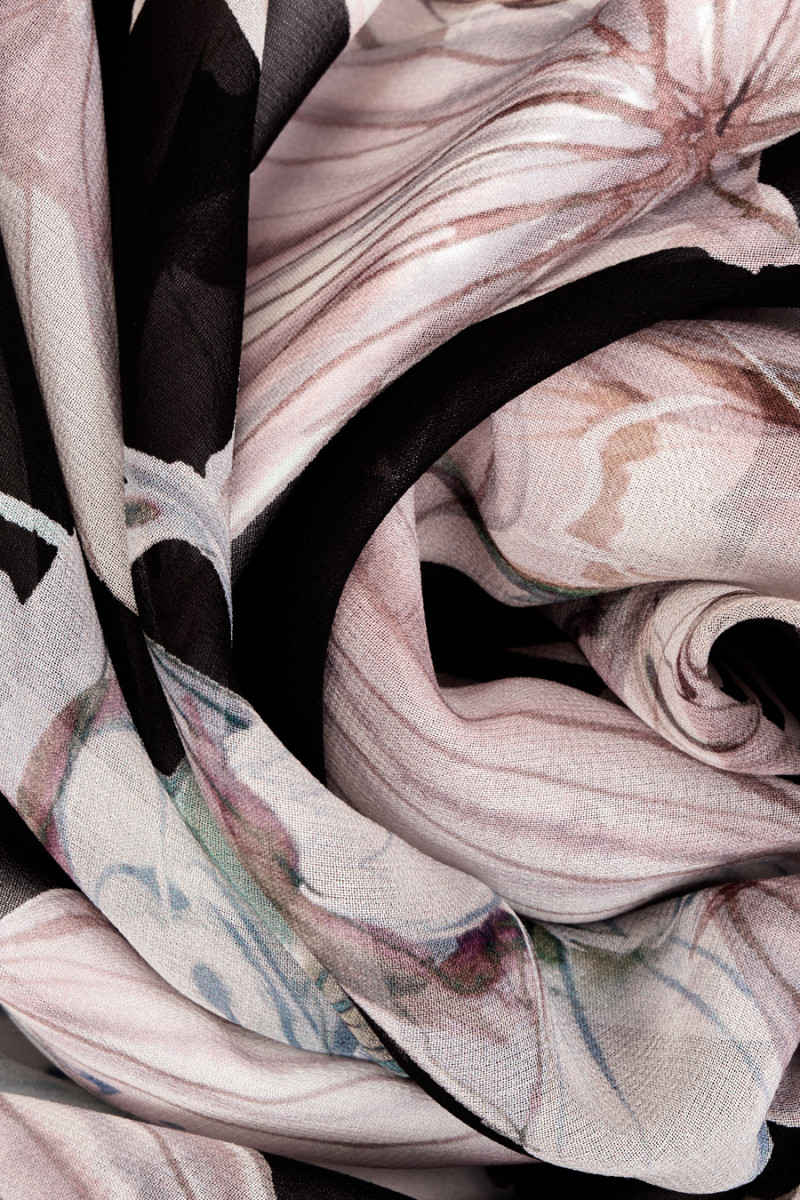 Itāļu šifons 100% zīds ar lieliem ziediem pasteļtoņos uz melna fona. Blīvs, atkārtots raksts, kas veidots gaišos rozā, zilā, zaļā, ziedu toņos ar izmēru 18cm*19cm. Audums ir viegls, gaisīgs, nedaudz caurspīdīgs un nāk no pazīstama modes dizainera kolekcijas. Skaists piedāvājums romantiskā izdevumā izveidot kleitu, blūzi vai svārkus.