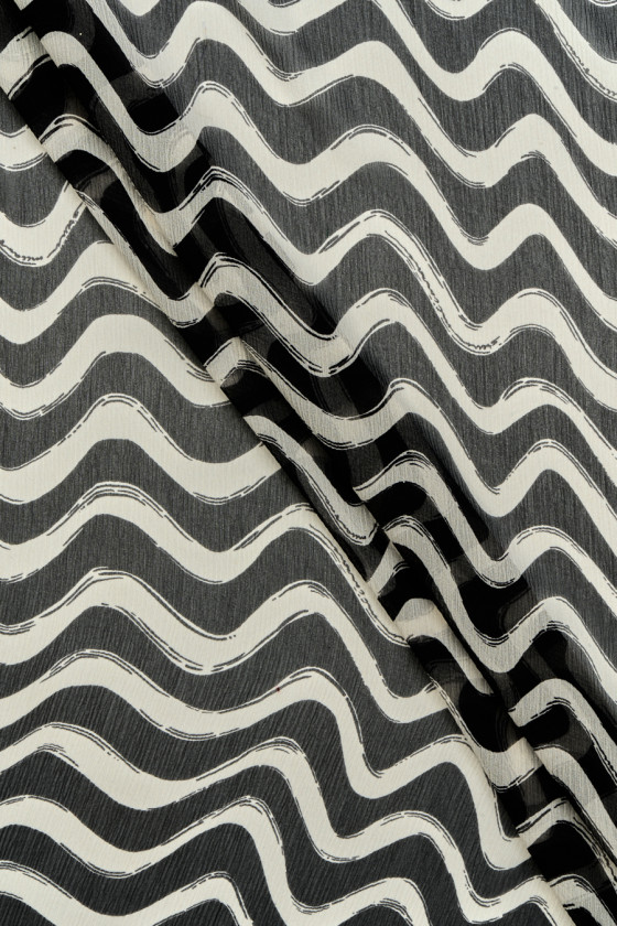 Itāļu šifons krokots 100% zīds ar baltu viļņu motīvu uz melna fona. Blīvs, atkārtots raksts, kas izvietots ik pēc 2 cm. Audums ir viegls, gaisīgs, caurspīdīgs un nāk no pazīstama modes dizainera kolekcijas. Interesants piedāvājums izveidot kleitu, blūzi vai svārkus.