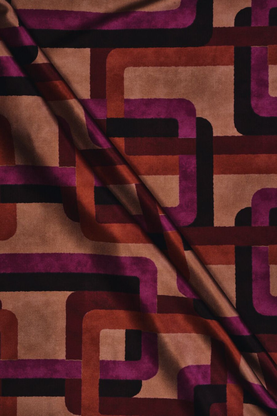 Itāļu zīda satīns ar elastāna pievienošanu ar ģeometriskiem motīviem fuksijā, brūns un oranžs uz kapučīno fona. Regulārs modelis taisnstūru veidā ar noapaļotām malām, kas pārklājas viena ar otru, izgatavotas skaistās rudens krāsās. Audums ir plūstošs, mīksts, elastīgs un skaisti spīdīgs, kas piešķir tam unikālu eleganci. Fantastisks piedāvājums, kas labi noderēs, šujot gaisīgas kleitas, svārkus, kā arī blūzes un kreklus.