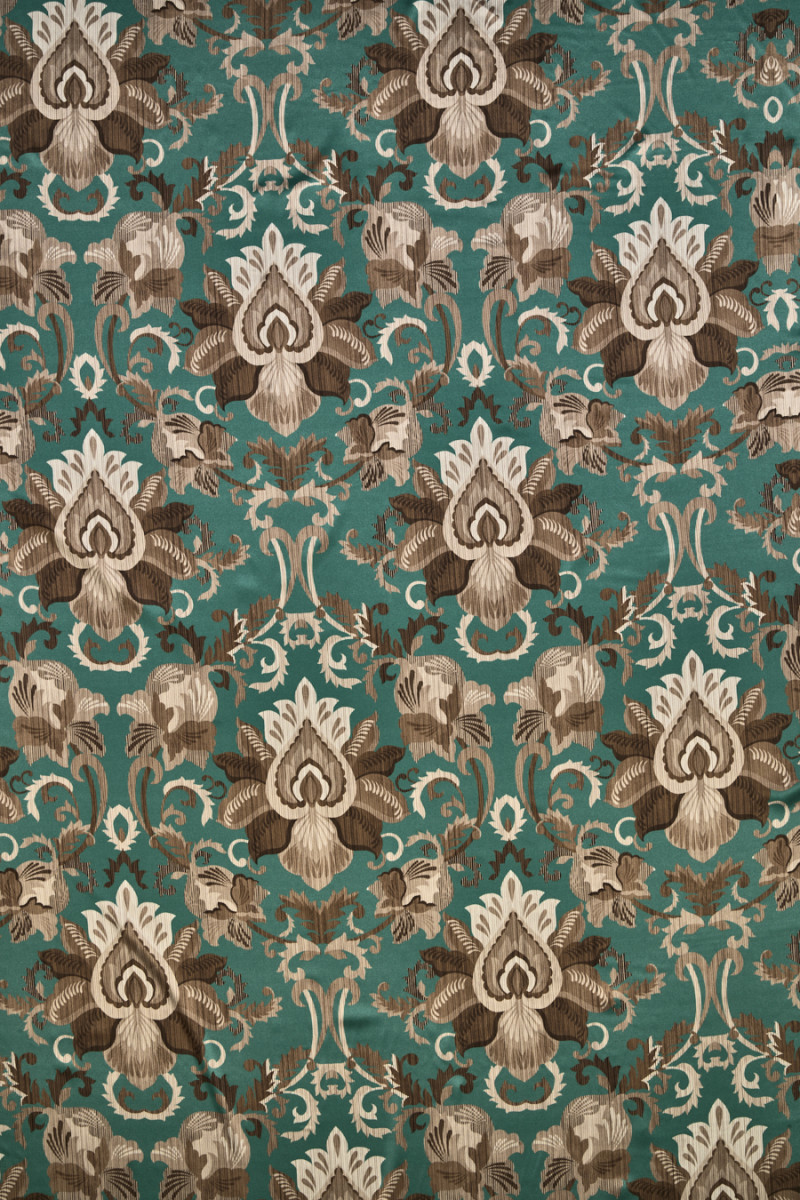 Itāļu zīda satīns ar elastāna pievienošanu ar austrumu motīvu uz putekļaini zaļa fona. Regulārais, lielais modelis, kas atgādina ziedus, ir izgatavots smilškrāsas toņos, lielākais zieds ir 27 cm garš un 38 cm plats. Audums ir plūstošs, mīksts, elastīgs un skaisti spīdīgs, kas piešķir tam unikālu eleganci. Skaists piedāvājums, kas lieliski piemērots rudens griezumiem, kas labi derēs gaisīgu kleitu, svārku, kā arī blūžu un kreklu šūšanā.