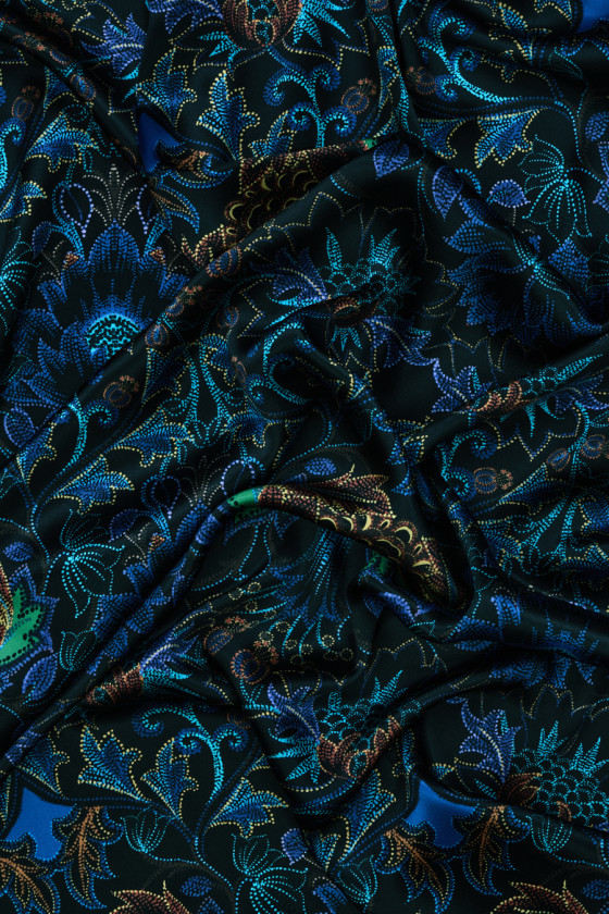 Itāļu satīns 100% zīds ar austrumu ziedu motīvu uz melna fona. Blīvs modelis, kas veidots diezgan spilgtos rudzupuķu, oranžu, zaļu un tirkīza toņos sīku punktu veidā, kas rada interesantu, austrumu veģetāciju. Audums ir plūstošs, mīksts, neelastīgs un skaisti spīdīgs, kas piešķir tam unikālu eleganci un nāk no pazīstama modes dizainera kolekcijas. Interesants piedāvājums, kas labi darbosies ar gaisīgām kleitām, svārkiem, kā arī blūzēm un krekliem.